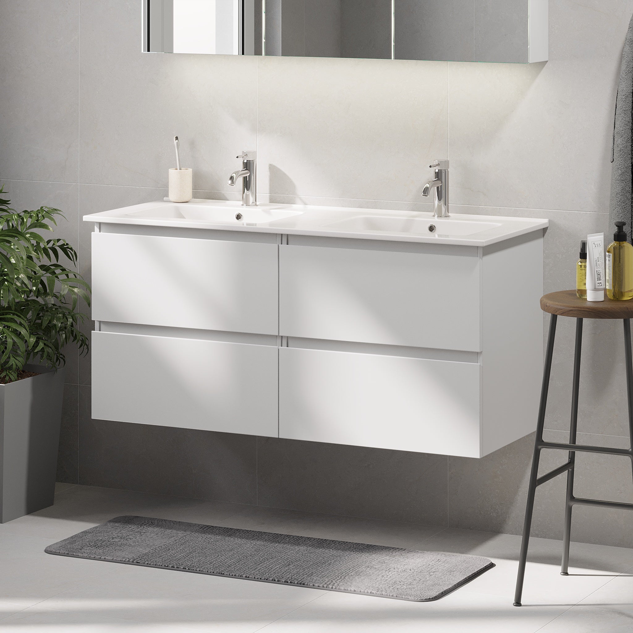 Ett elegant badrumsskåp med handfat i modern design, perfekt för alla badrum. Skåpet har en mattvit finish, vilket ger ditt utrymme ett fräscht och rent utseende. Det har praktiska handtag för enkel öppning och stängning, diskret integrerade längs hela skåpets framsida. Detta designelement säkerställer ett minimalistiskt utseende, fritt från onödiga distraktioner.